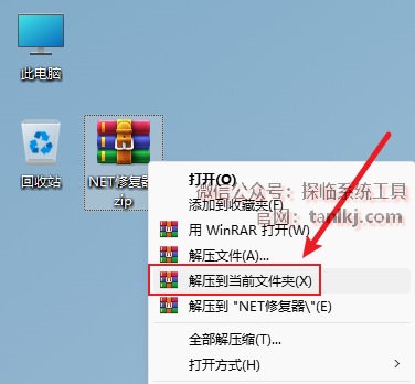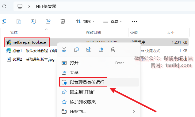 打开解压后的文件夹,右键程序【netfxrepairtool】,点击【以管理员身份运行】。