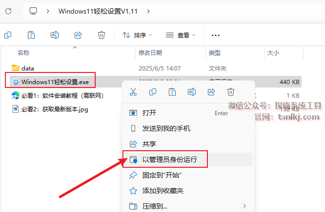 打开解压后的文件夹,右键程序【Windows11轻松设置】,点击【以管理员身份运行】。