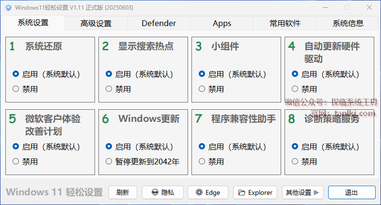 Windows11 轻松设置 是一款绿色免安装的系统优化工具,适配 Windows10/11 系统且无广告。它整合系统优化、界面定制、隐私管理、应用管理等多功能,可一键关闭冗余服务、恢复经典右键菜单、管理系统更新,还能批量卸载预装软件或安装常用工具。更新后优化常用软件安装信息,操作简洁直观,兼顾普通用户日常优化与进阶用户深度定制需求,是高效打理系统的实用助手。
