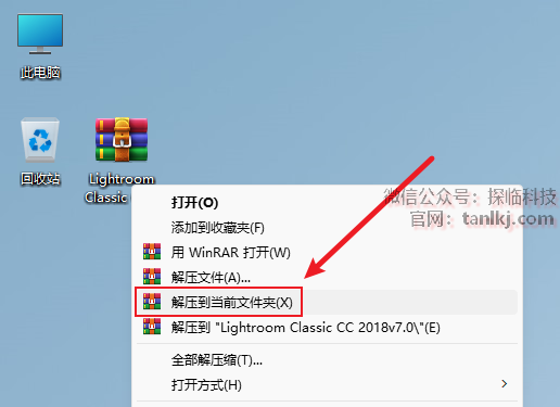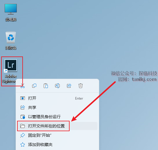 在桌面,右键软件【Adobe Lightroom Classic CC】,点击【打开文件所在的位置】。