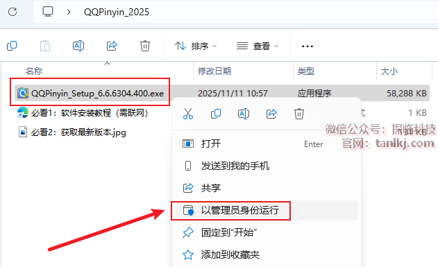 打开解压后的文件夹,右键程序【QQPinyin_Setup…】,点击【以管理员身份运行】。