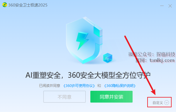 点击【自定义】(如不想更改软件默认的安装位置,直接点击【同意并安装】即可)。