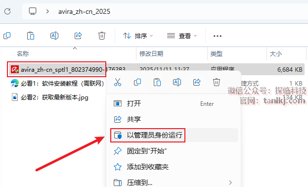 打开解压后的文件夹,右键程序【avira_zh-cn…】,点击【以管理员身份运行】。
