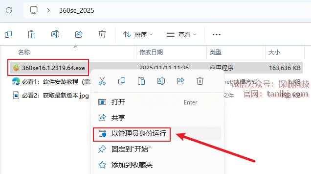 打开解压后的文件夹,右键程序【360se…】,点击【以管理员身份运行】。