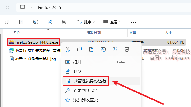 打开解压后的文件夹,右键程序【Firefox Setup…】,点击【以管理员身份运行】。