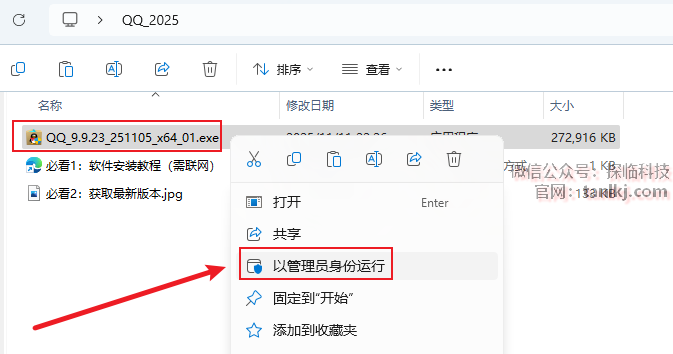 打开解压后的文件夹,右键程序【QQ…】,点击【以管理员身份运行】。