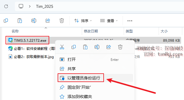 打开解压后的文件夹,右键程序【TIM…】,点击【以管理员身份运行】。