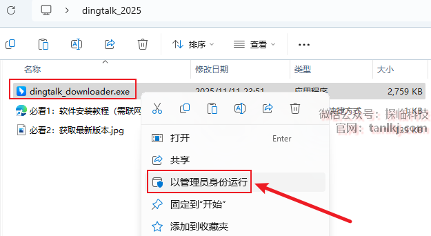 打开解压后的文件夹,右键程序【dingtalk…】,点击【以管理员身份运行】。