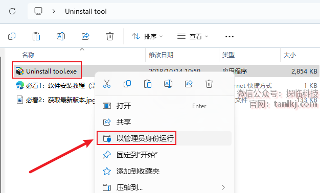 打开解压后的文件夹,右键程序【Uninsatall tool】,点击【以管理员身份运行】。