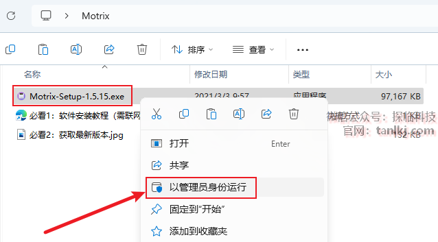 打开解压后的文件夹,右键程序【Mortix-Setup…】,点击【以管理员身份运行】。