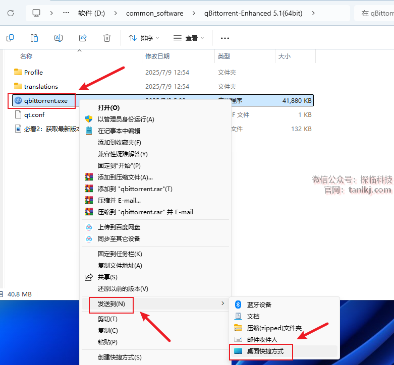 给软件创建桌面快捷方式。右键程序【qbittorrent】,点击【发送到】(win系统先点击【显示更多选项】),点击【桌面快捷方式】。