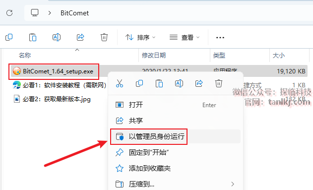 打开解压后的文件夹,右键程序【BitComet…】,点击【以管理员身份运行】。