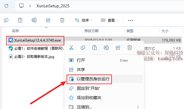 打开解压后的文件夹,右键程序【XunLeiSetup…】,点击【以管理员身份运行】。