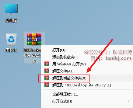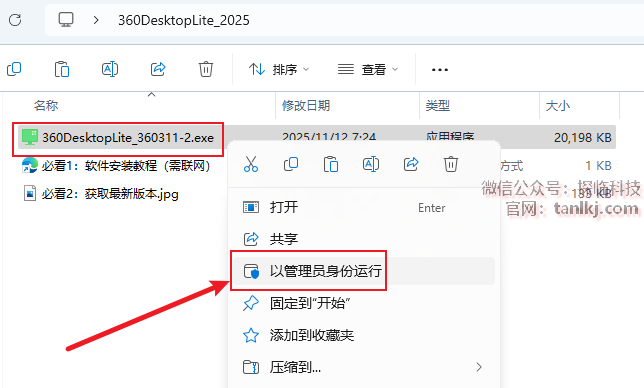 打开解压后的文件夹,右键程序【360DesktopLite…】,点击【以管理员身份运行】。