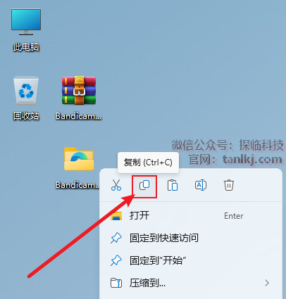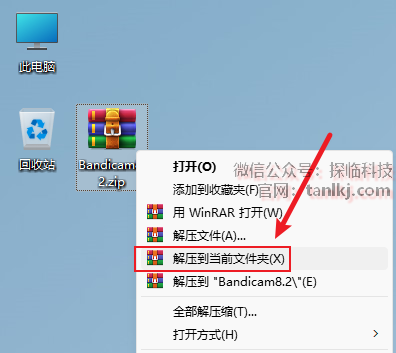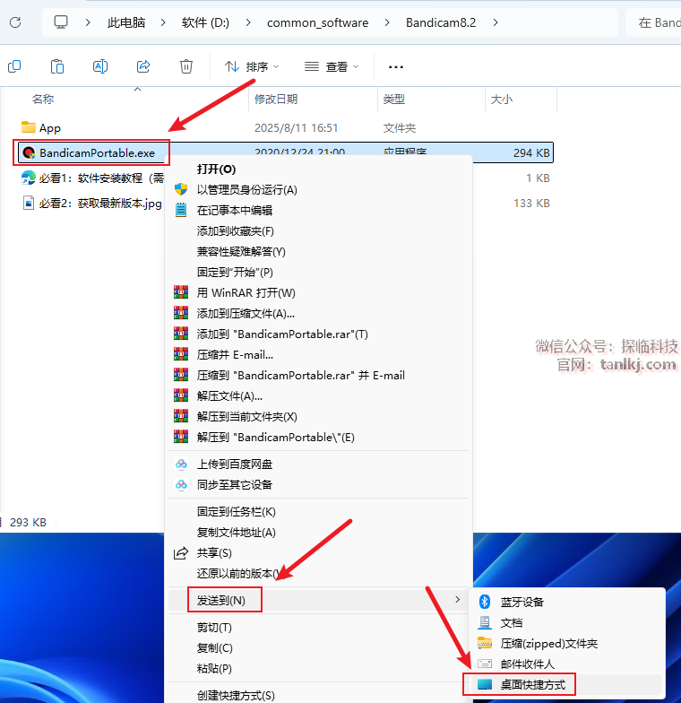 为软件创建桌面快捷方式。右键程序【BandicamPortable】,点击【发送到】(win11需先点击【显示更多选项】),点击【桌面快捷方式】。