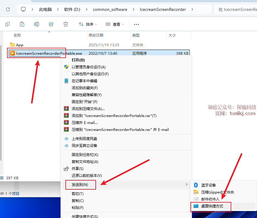 为软件创建桌面快捷方式。右键程序【IcecreamScreenRecorder…】,点击【发送到】(win11先点击【显示更多选项】),点击【桌面快捷方式】。