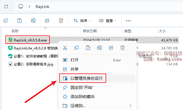 打开解压后的文件夹,右键程序【RayLink…】,点击【以管理员身份运行】。