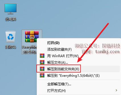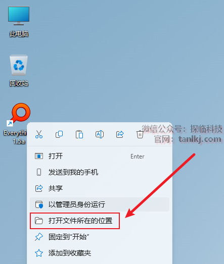 在桌面,右键软件【Everything】,点击【打开文件所在的位置】。