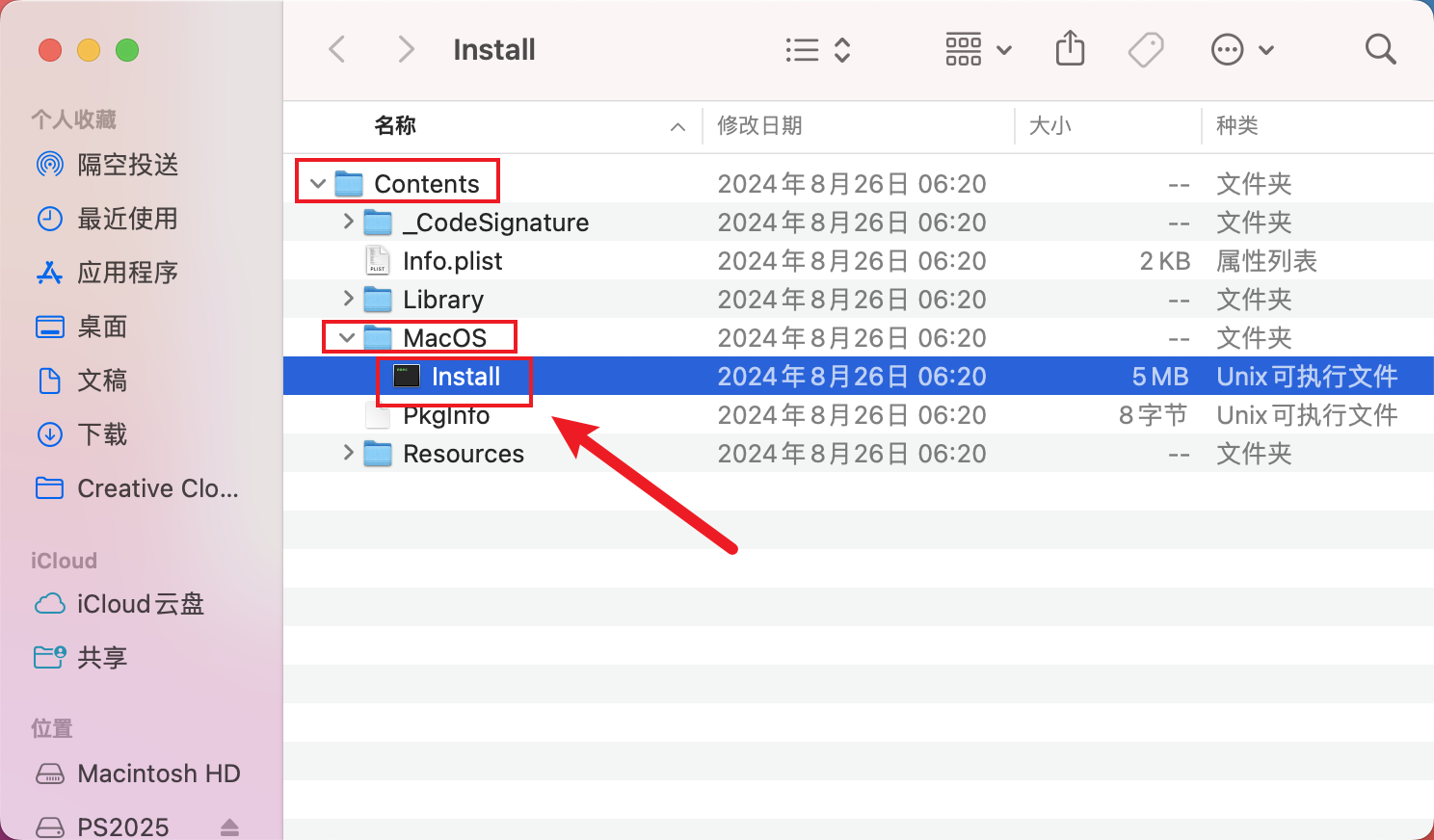 依次点开文件夹【Contents】->【MacOS】->【Install】。