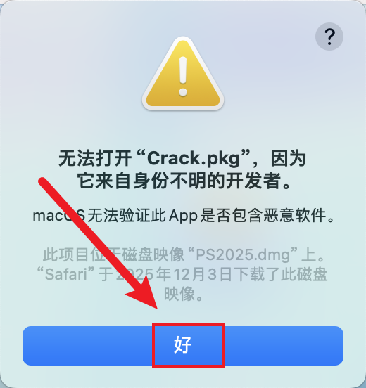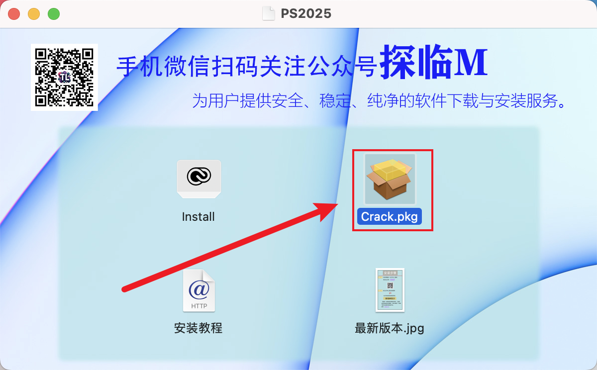 回到打开后的【PS2025.dmg】界面中,双击打开【Crack.pkg】。