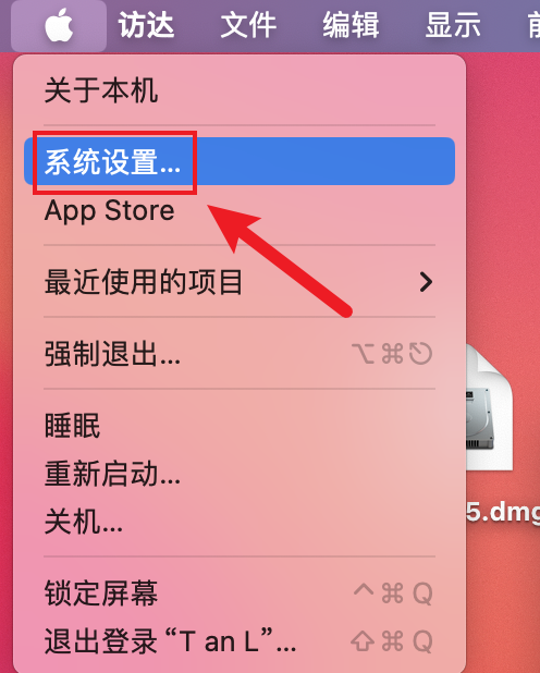 点击左上角【苹果】标志,点击【系统设置】。