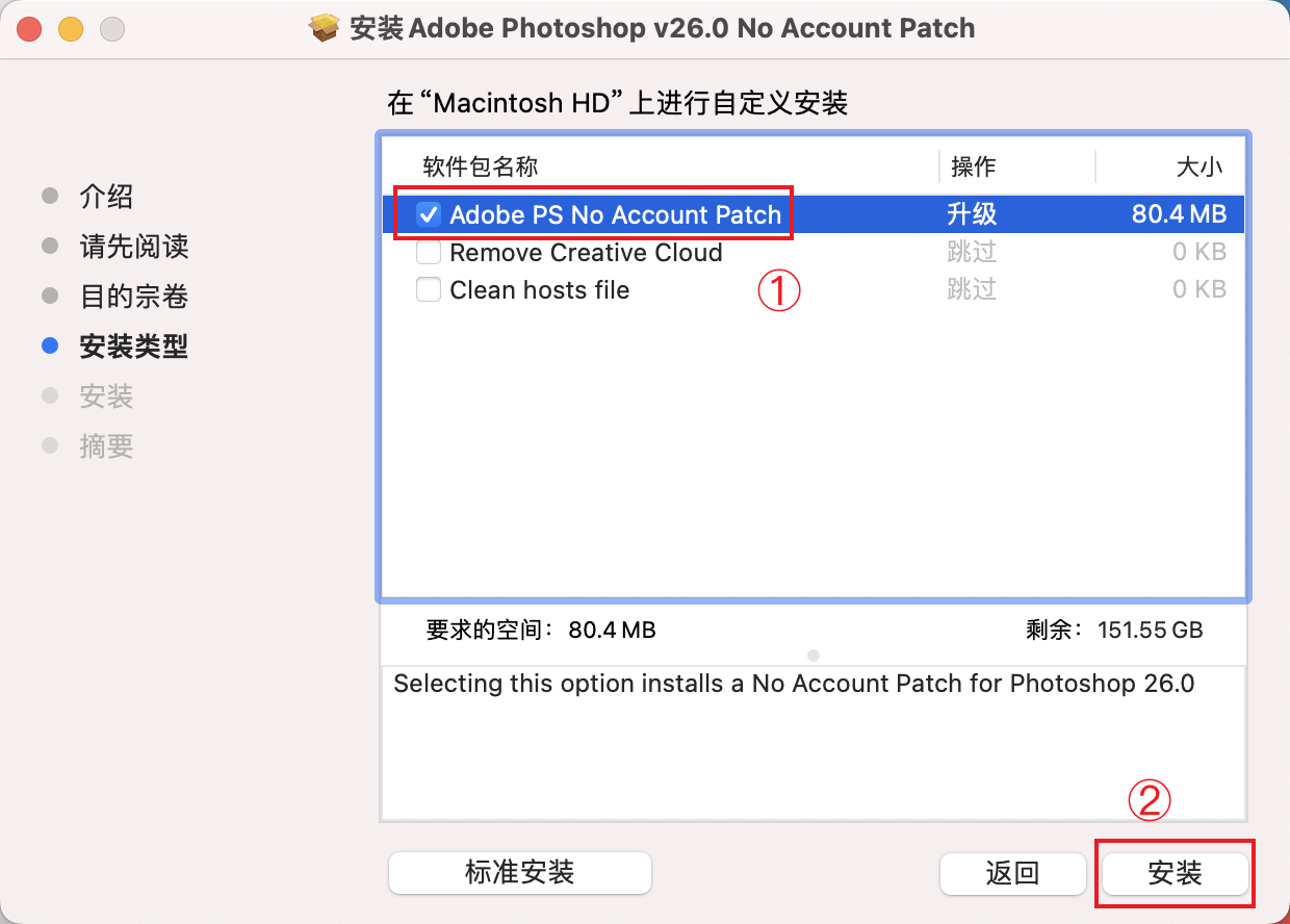 ①勾选【Adobe PS No Account Patch】;