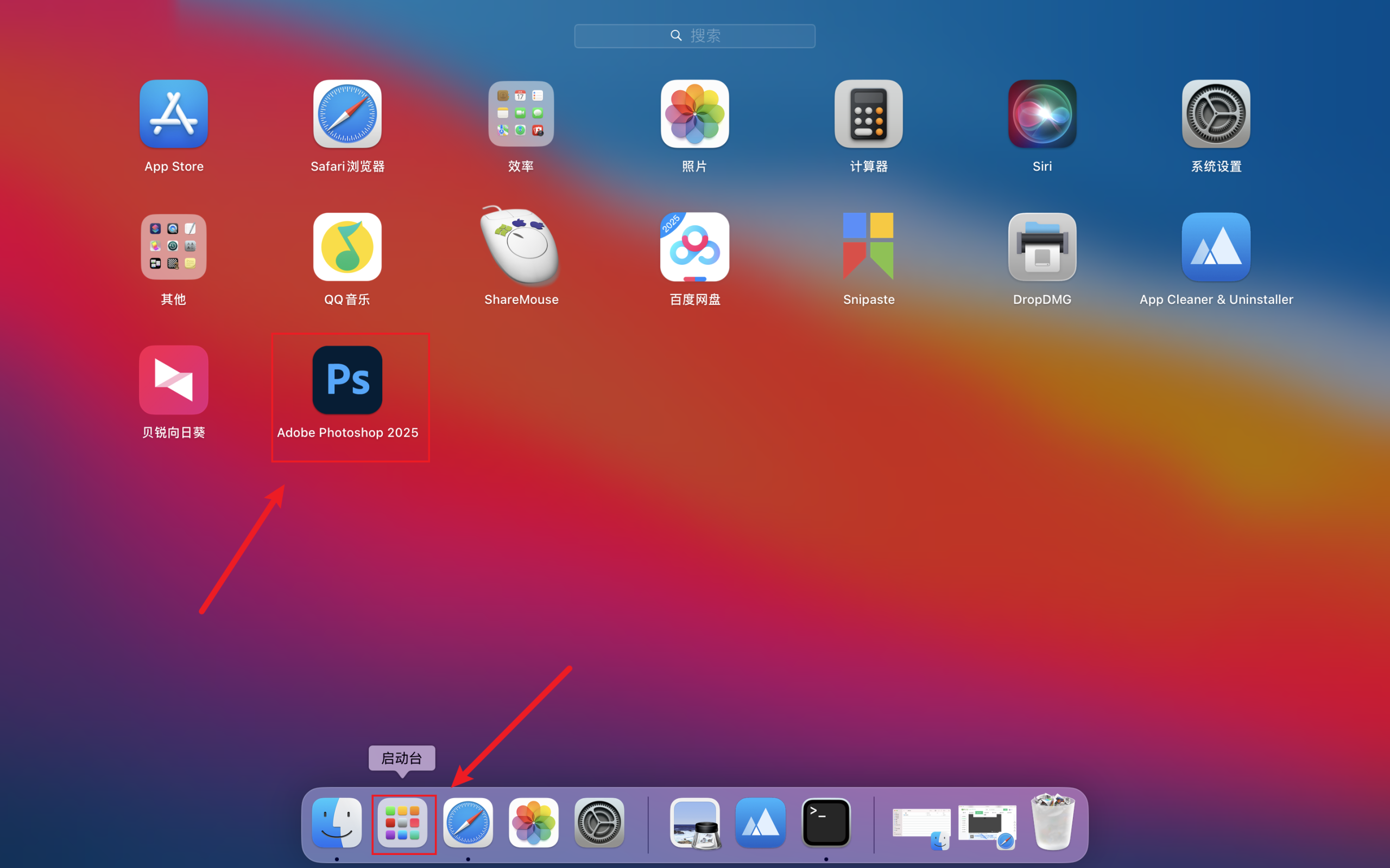 点击【启动台】,找到并点击运行刚刚安装的软件【Adobe Photoshop 2025】。
