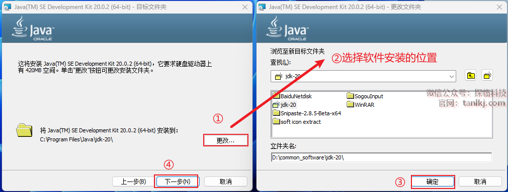 ②选择软件安装的位置,安装路径中不能包含任何中文字符,建议新建文件夹【jdk-20】作为安装位置;