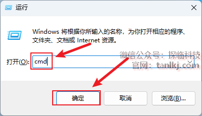 按下快捷键【win】+【R】,输入:cmd,点击【确定】。