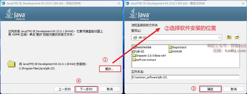 ②选择软件安装的位置,安装路径中不能包含任何中文字符,建议新建文件夹【jdk-22】作为安装位置;