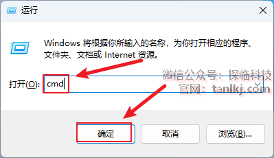 按下快捷键【win】+【R】,输入:cmd,点击【确定】。