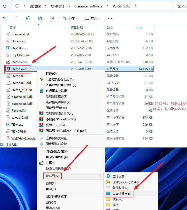 找到并右键程序【PSPad】,点击【发送到】(win11系统需先点击【显示更多选项】),点击【桌面快捷方式】。