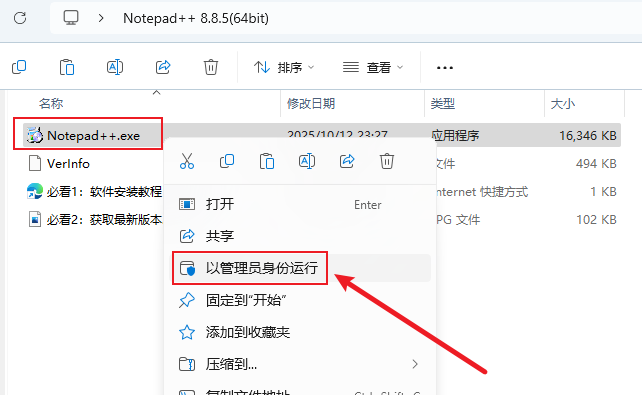 打开解压后的文件夹,右键程序【Notepad++】,点击【以管理员身份运行】。