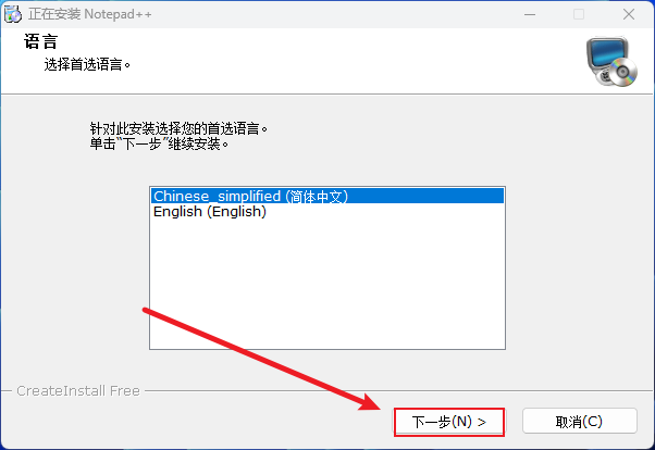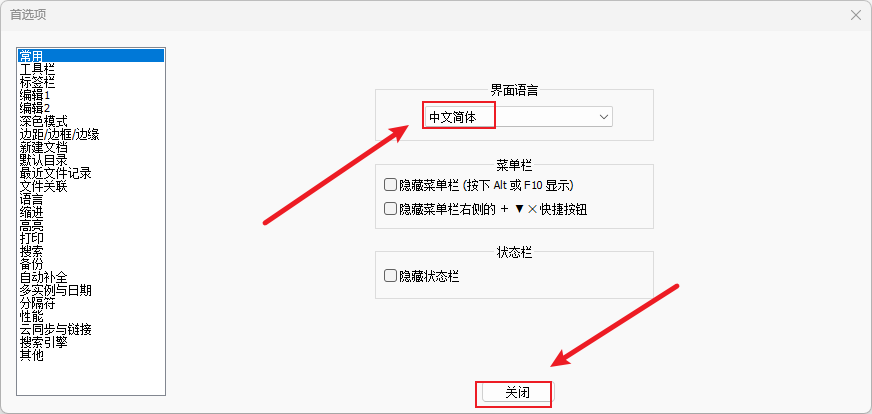 语言栏中选择【中文简体】,点击【关闭】。