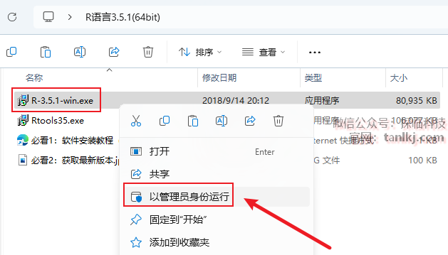 打开解压后的文件夹,右键程序【R-3.5.1-win】,点击【以管理员身份运行】。