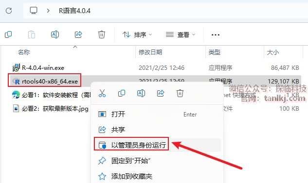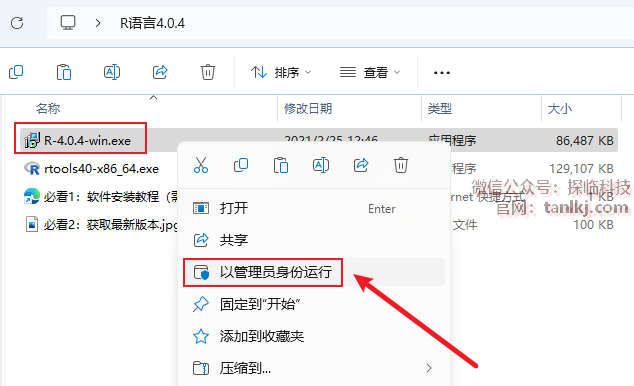 打开解压后的文件夹,右键程序【R-4.0.4-win】,点击【以管理员身份运行】。