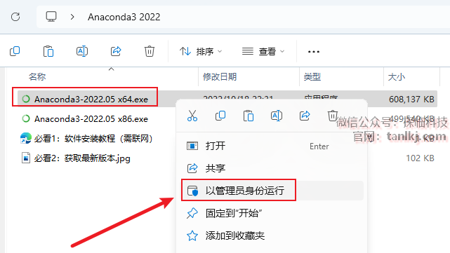 打开解压后的文件夹,右键程序【Anaconda3-2022.05 x64】,点击【以管理员身份运行】(根据自己电脑系统位数选择对应程序)。