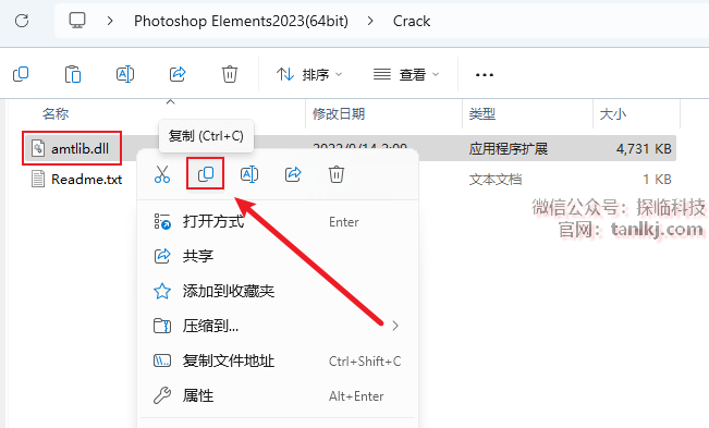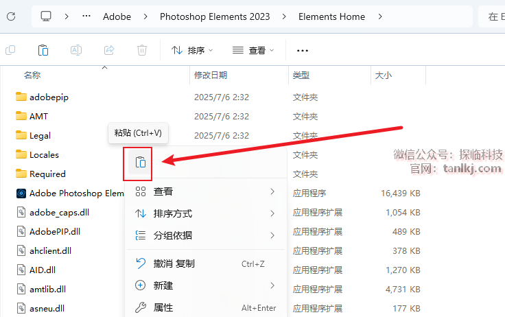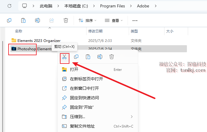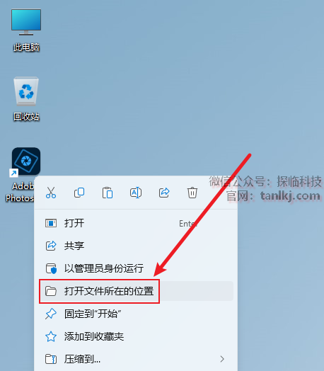 在桌面,右键软件【Adobe Photoshop Elements】,点击【打开文件所在的位置】。