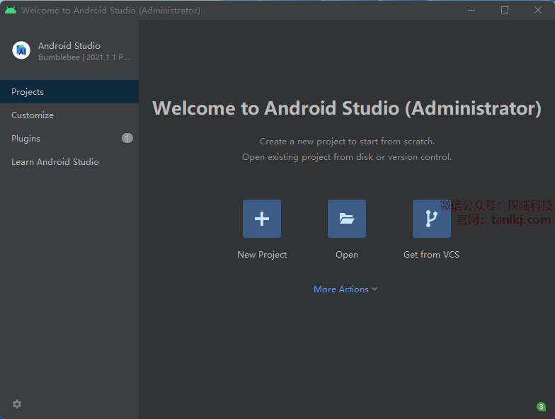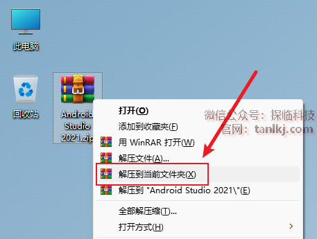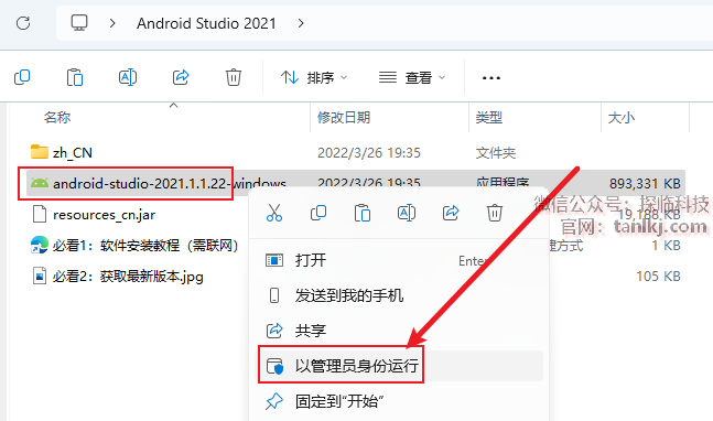 打开解压后的文件夹,右键程序【android-studio-2021…】,点击【以管理员身份运行】。