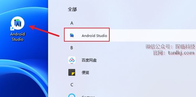 找到软件【Android Studio】,并将其拖至桌面创建快捷方式。