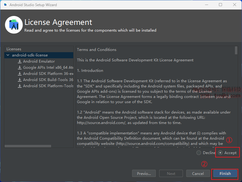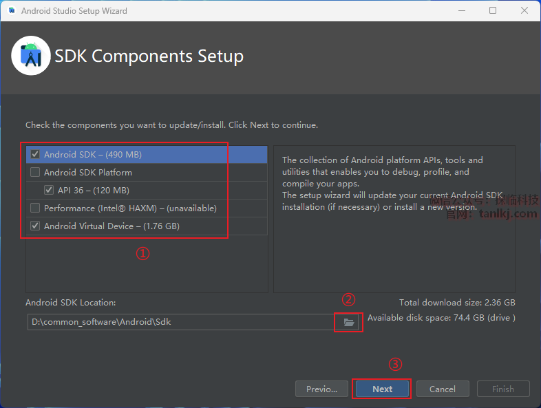 ②点击【文件夹】图标可以更改Android SDK Location位置;