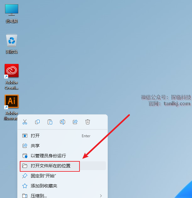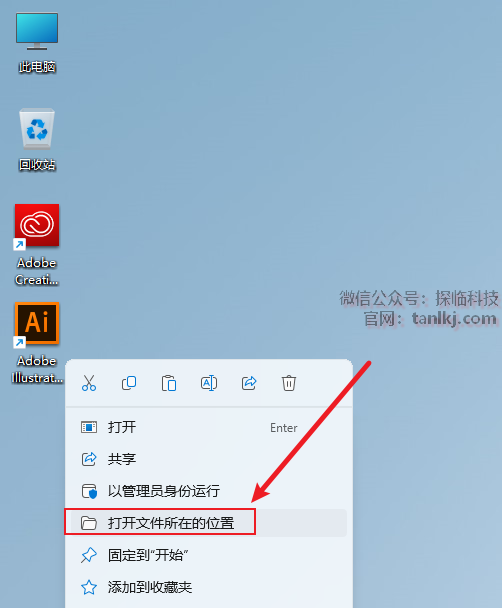 在桌面,右键软件【Adobe Illustrator CC 2017】,点击【打开文件所在的位置】。