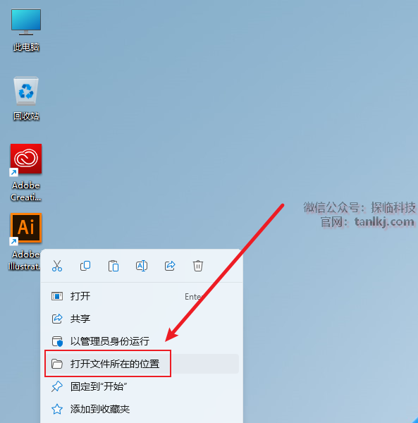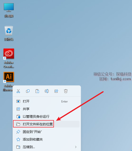 在桌面,右键软件【Adobe Illustrator CC 2018】,点击【打开文件所在的位置】。