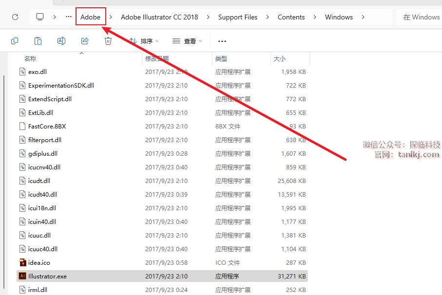在弹出来的文件夹内,点击上方地址栏中的【Adobe】。