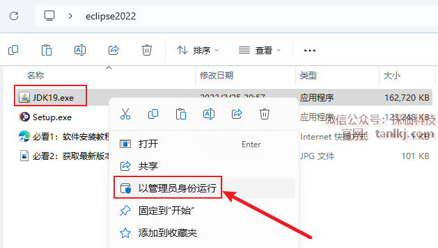 打开解压后的文件夹,右键程序【JDK19】,点击【以管理员身份运行】。