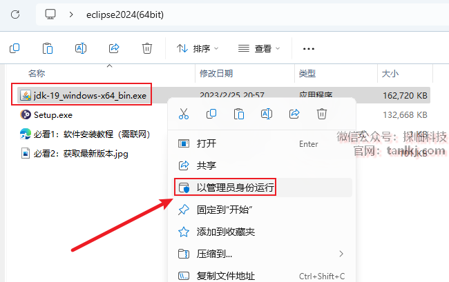 打开解压后的文件夹,右键程序【JDK-19…】,点击【以管理员身份运行】。
