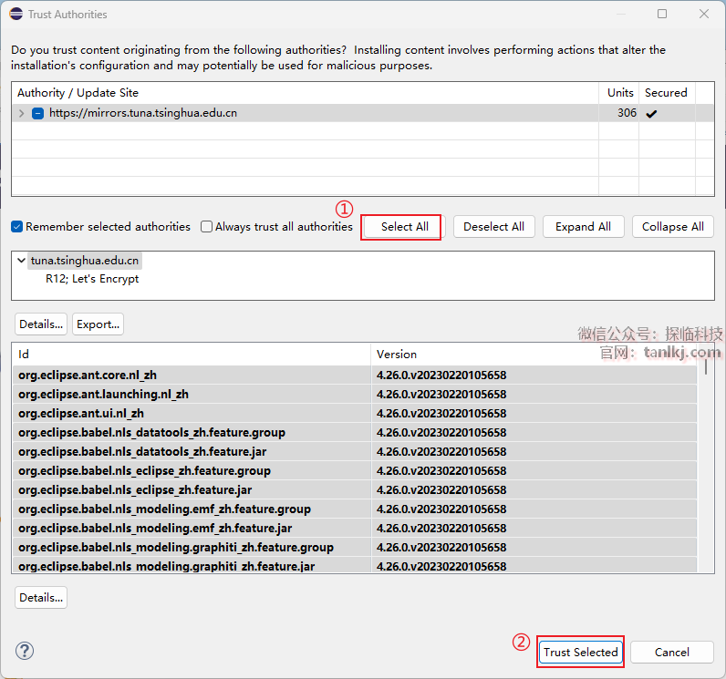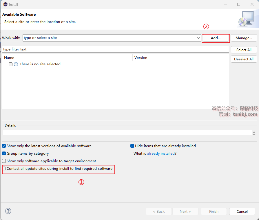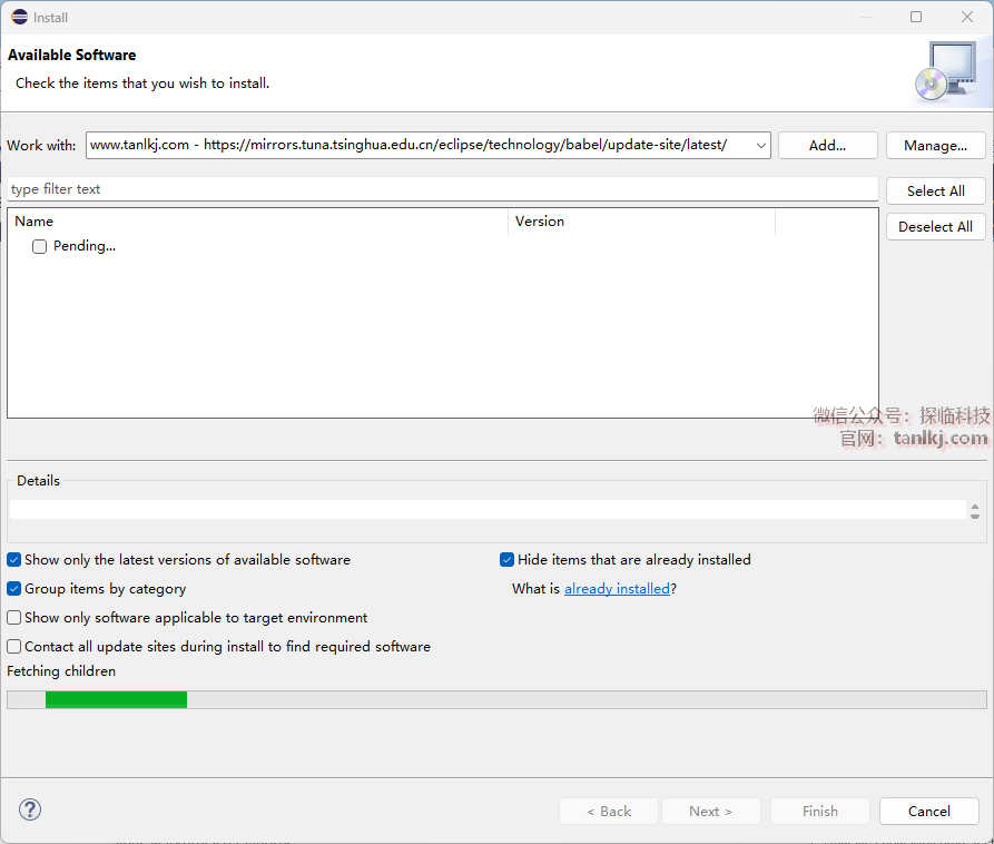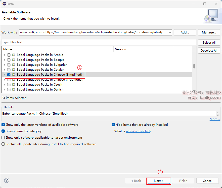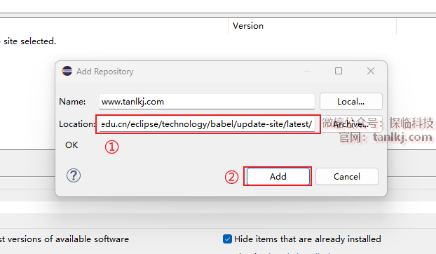 ①Location框中输入:https://mirrors.tuna.tsinghua.edu.cn/eclipse/technology/babel/update-site/latest/