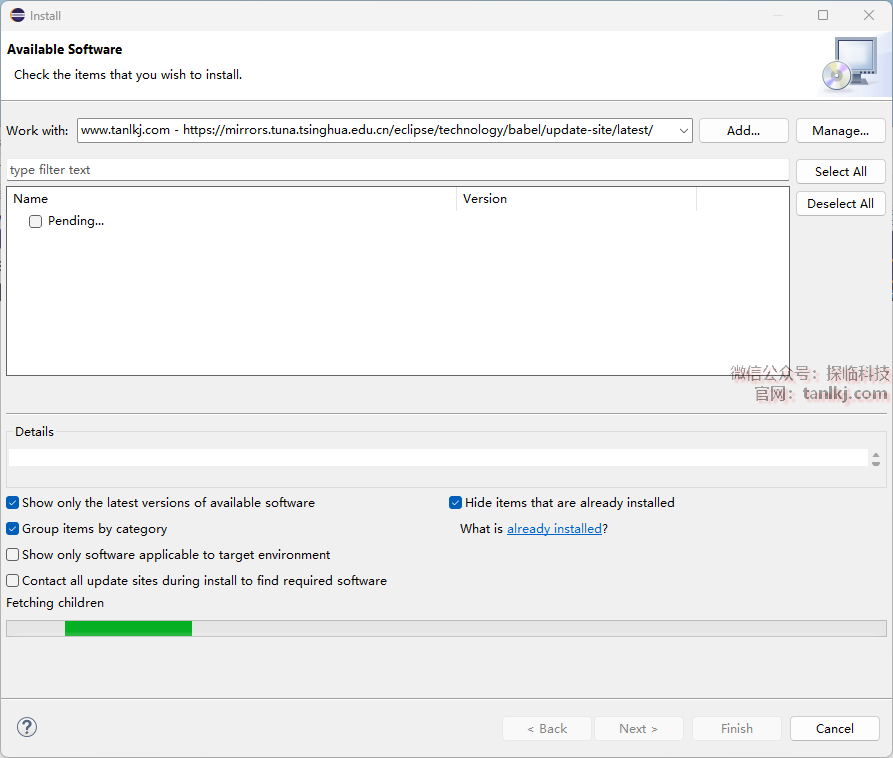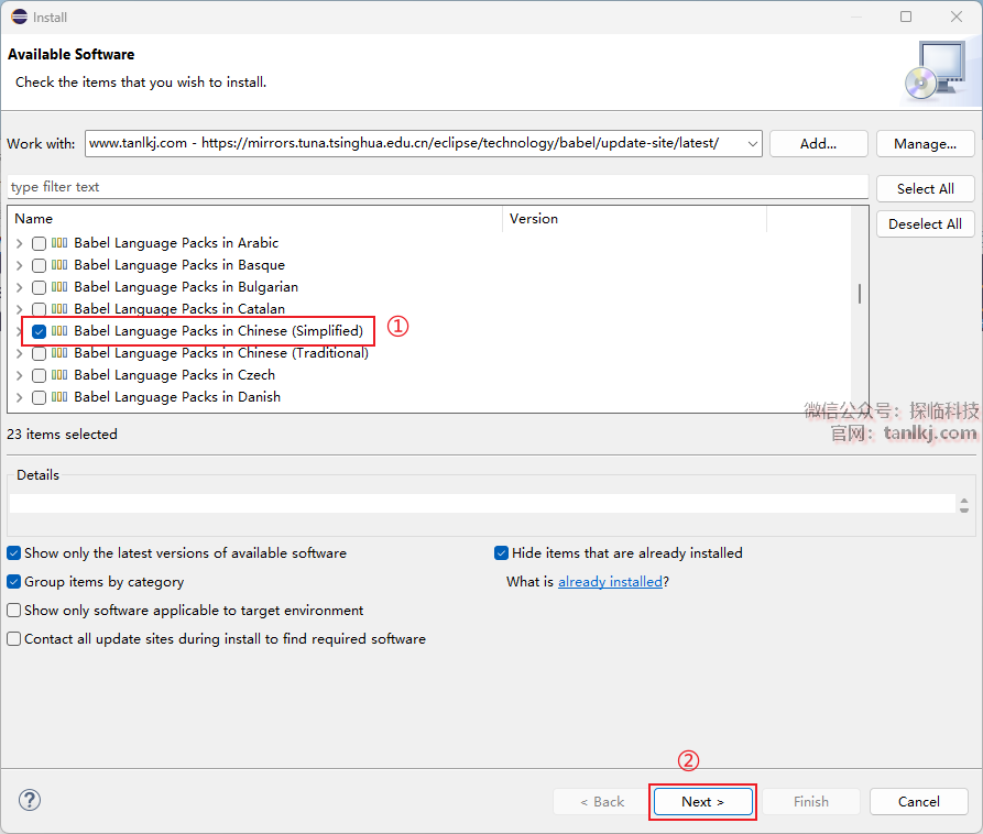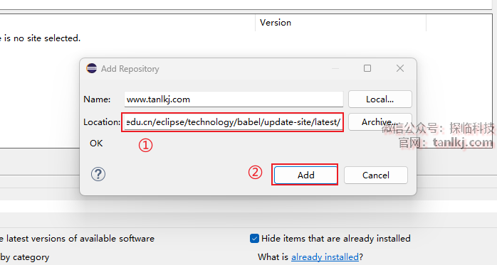 ①Location框中输入:https://mirrors.tuna.tsinghua.edu.cn/eclipse/technology/babel/update-site/latest/