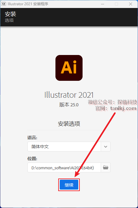 更改软件默认的安装位置,如不需更改,直接点击【继续】即可。