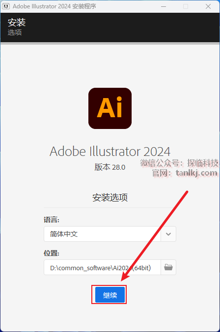 更改软件默认的安装位置,如不需更改,直接点击【继续】即可。
